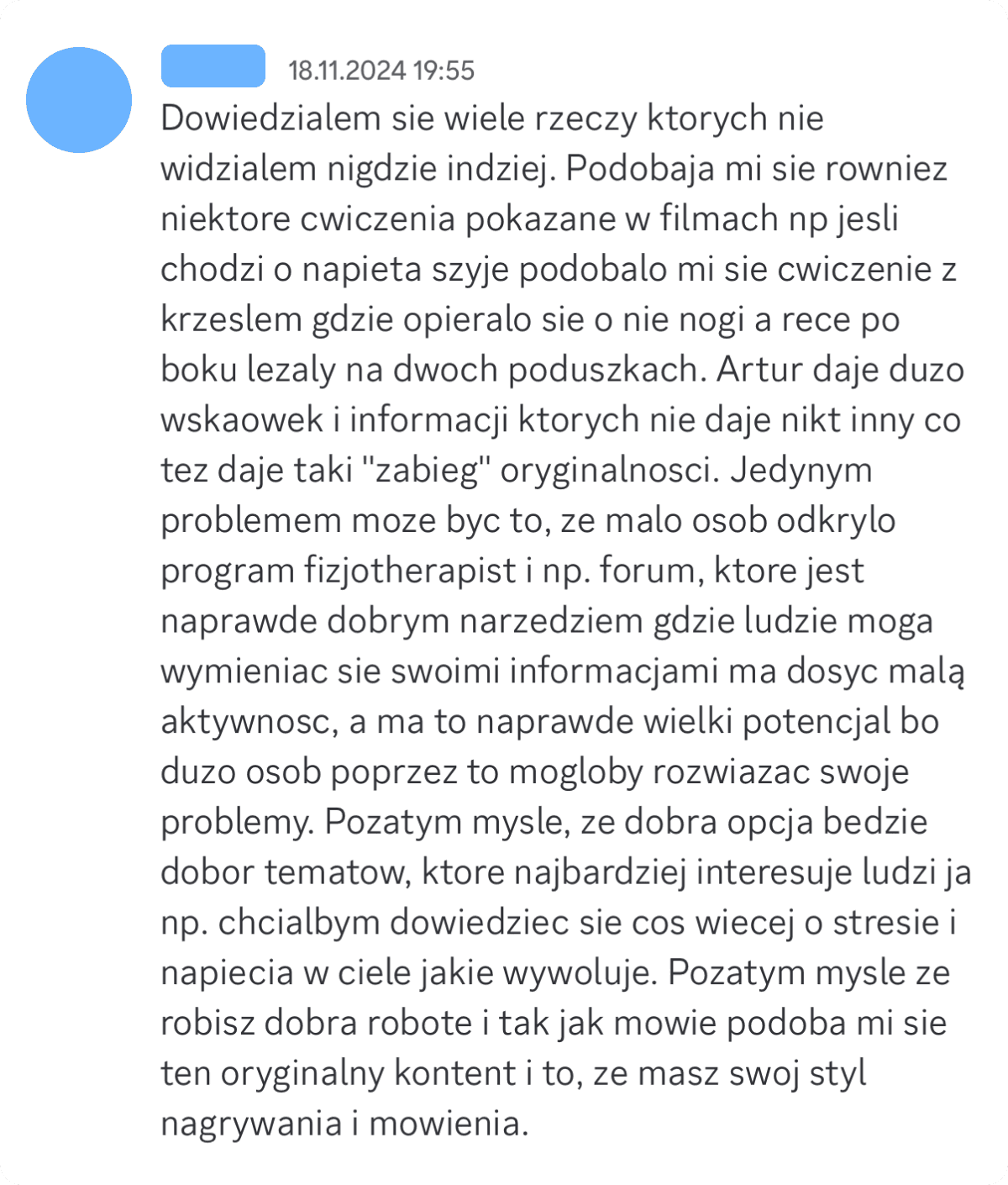 Jesteś gotów zrobić choćby jeden pełny Program Fizjotherapist na 2 tygodnie. Taki trwa często ok 30 minut, ale prócz ćwiczeń ZROZUMIESZ dlaczego je robisz i zwiększysz swoją świadomość momentalnie.